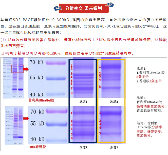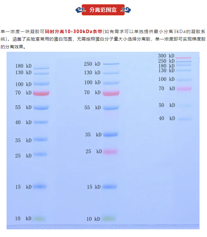 普利萊深挖SDS-PAGE蛋白凝膠電泳基本理論結合既往產品實踐經驗,經研發優選,全新推出可以同時分離10-300kDa寬范圍大小條帶、分辨率高、電泳速率快的通用系統,即UltraGel寬范圍高分辨配膠試劑盒,與常規配膠試劑盒相比具有以下特征: